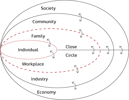 The immediate close circle influences the individual’s attitudes and behaviours. The individual, the family and the workplace are part of an interdependent continuum. An individual’s decision is impacted by what is happening in their close circle, and vice versa, which effects the community and industry.